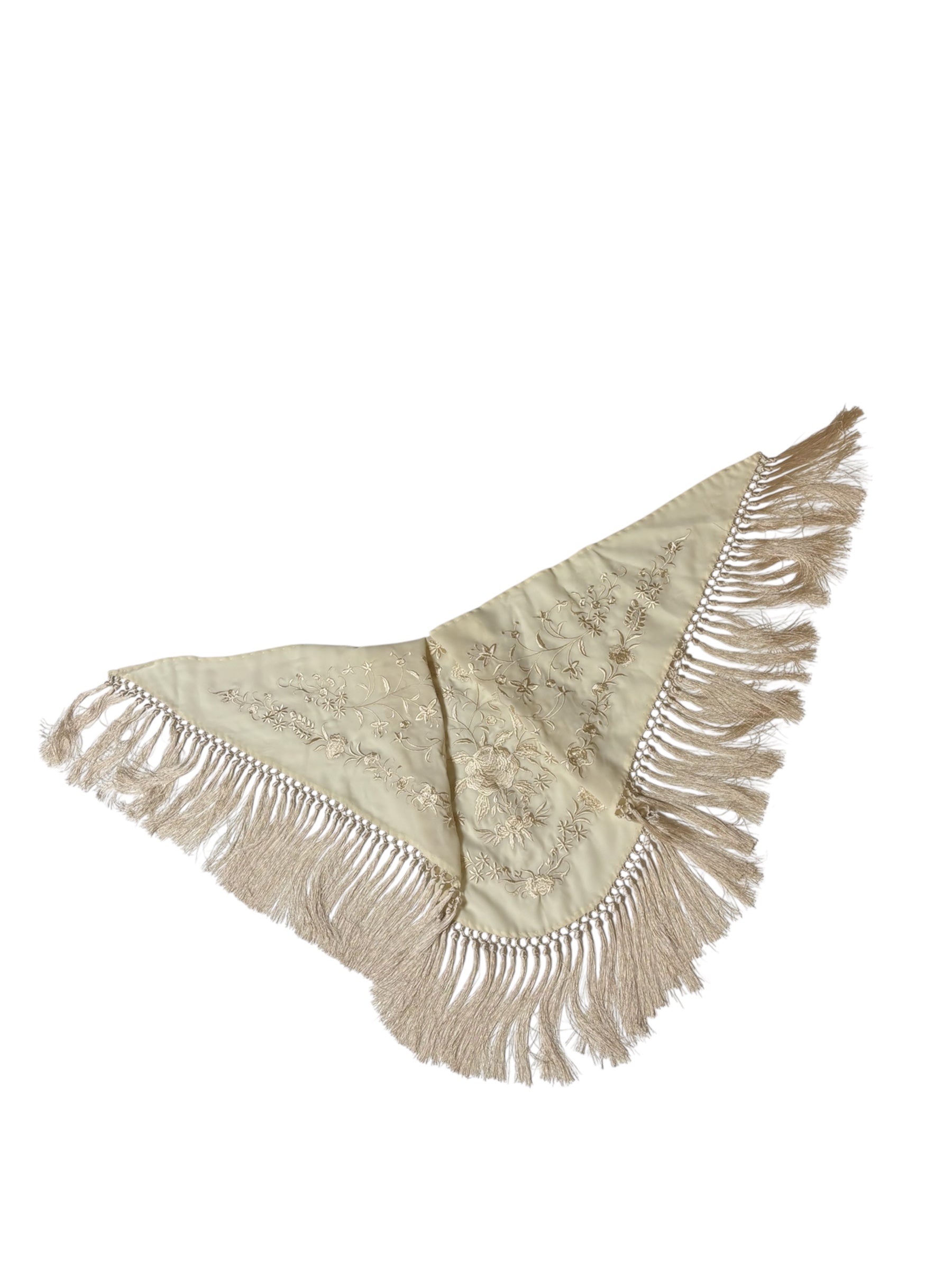 Mantón en color blanco roto, con bordado floral del mismo color y acabado en fleco corto.