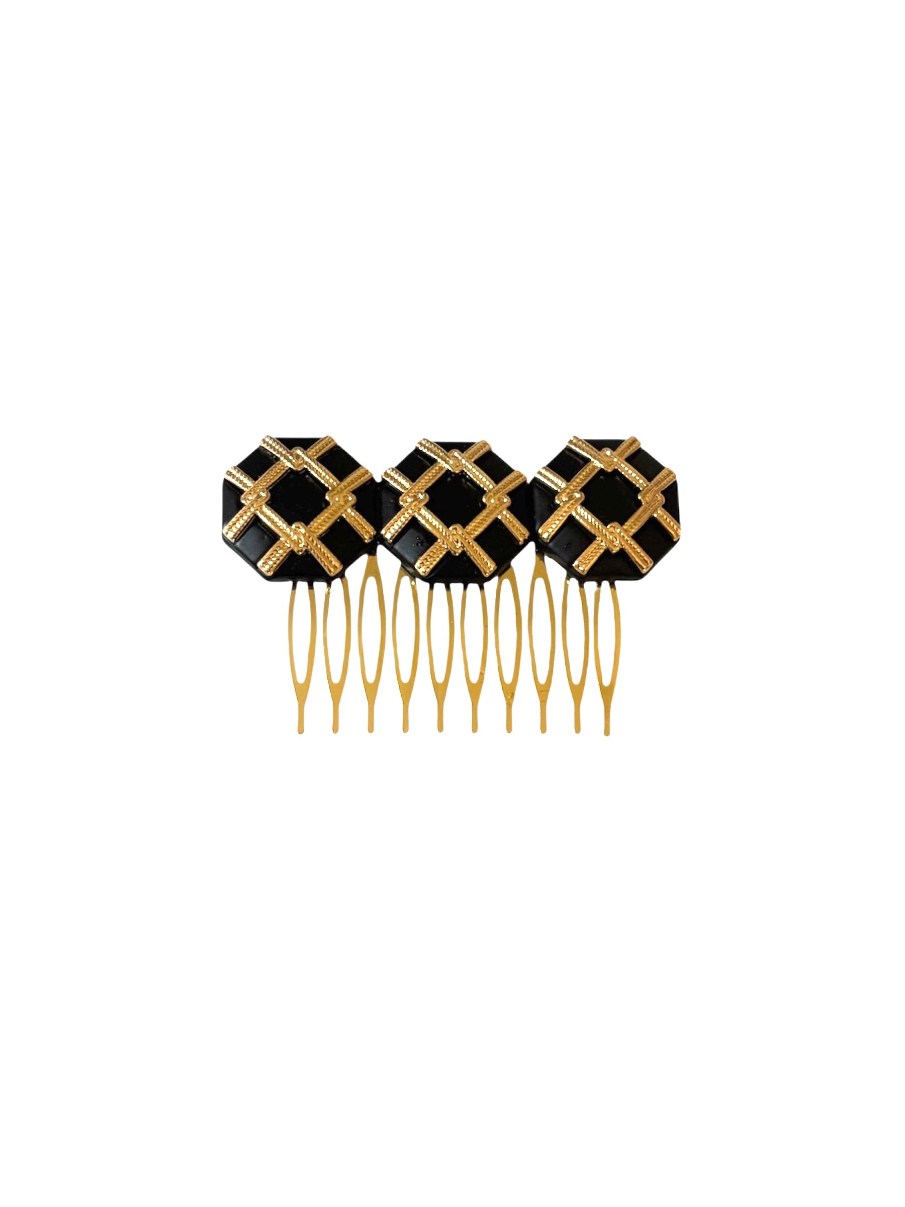 Peina artesanal con base negra adornada con figuras doradas entrelazadas.