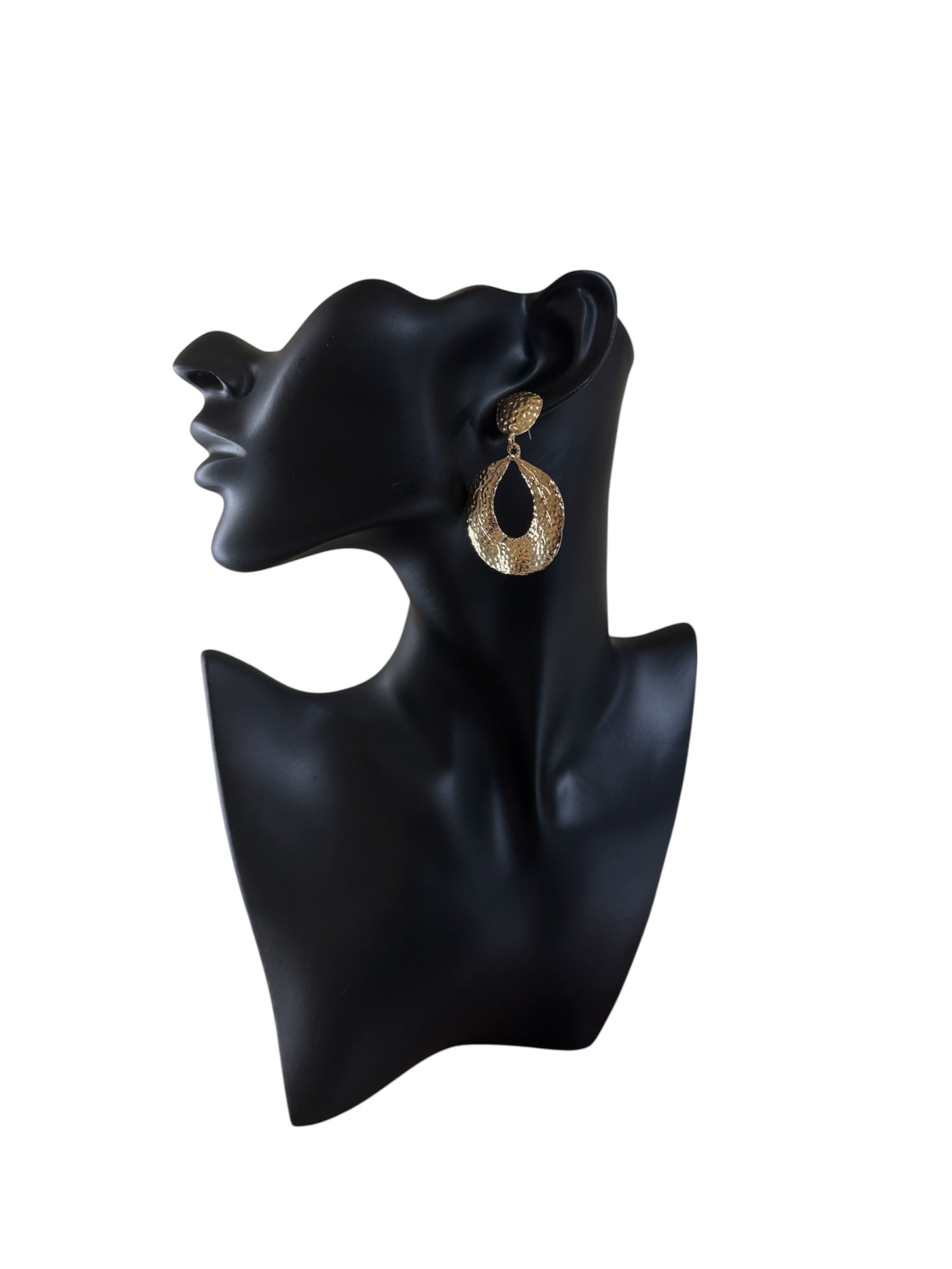 Pendientes colgantes dorados con forma oval y efecto martillado.