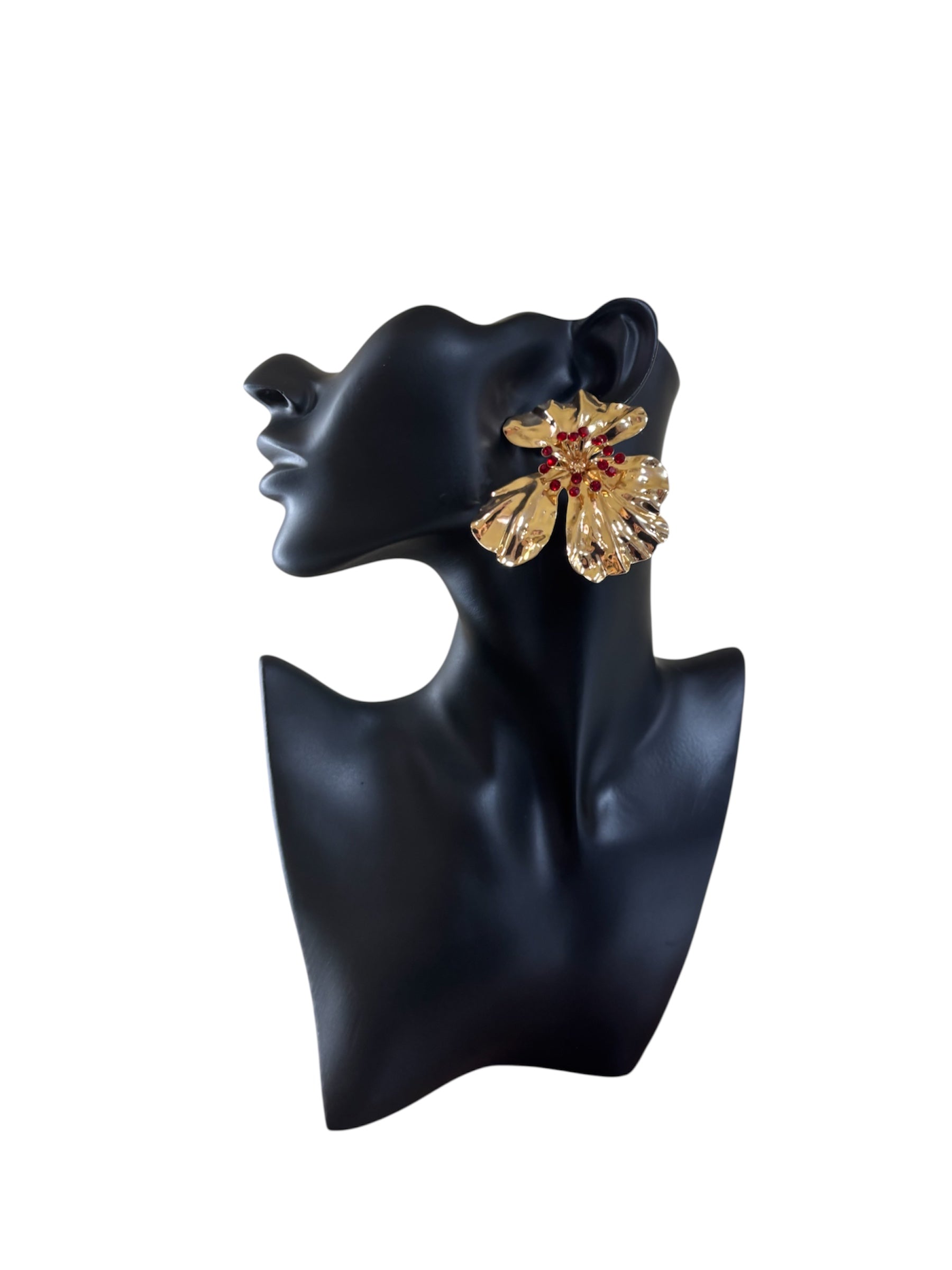 Pendientes dorados en forma de flor con detalles rojos en el centro.