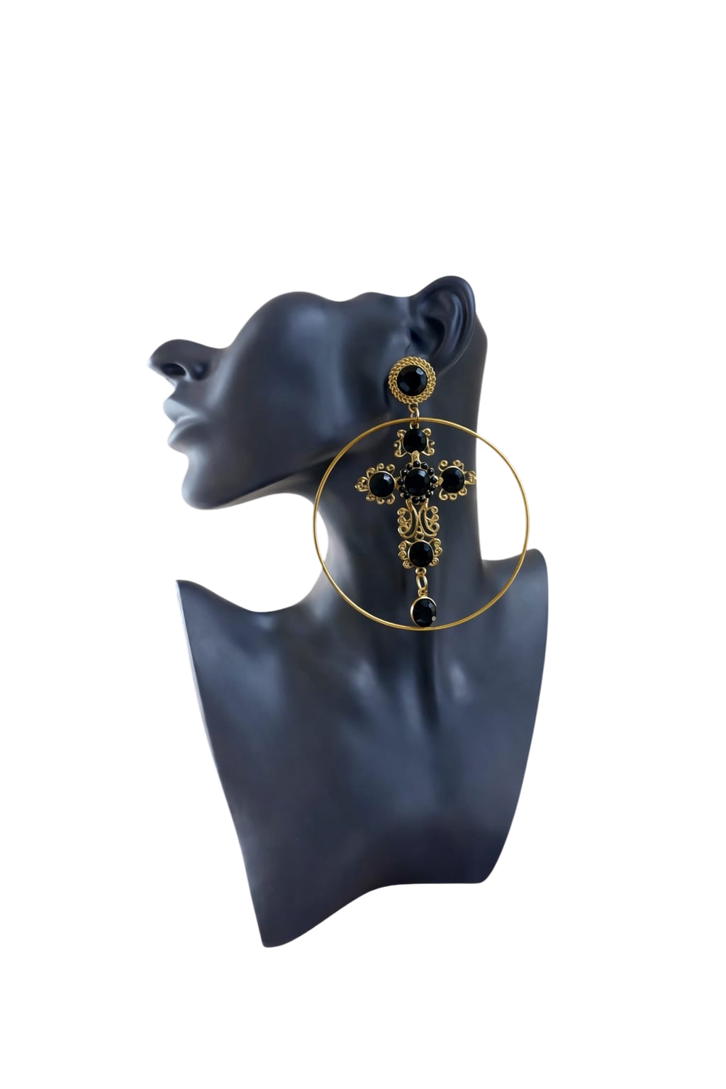 Pendientes dorados con aro grande y cruz central decorada con piedras negras.