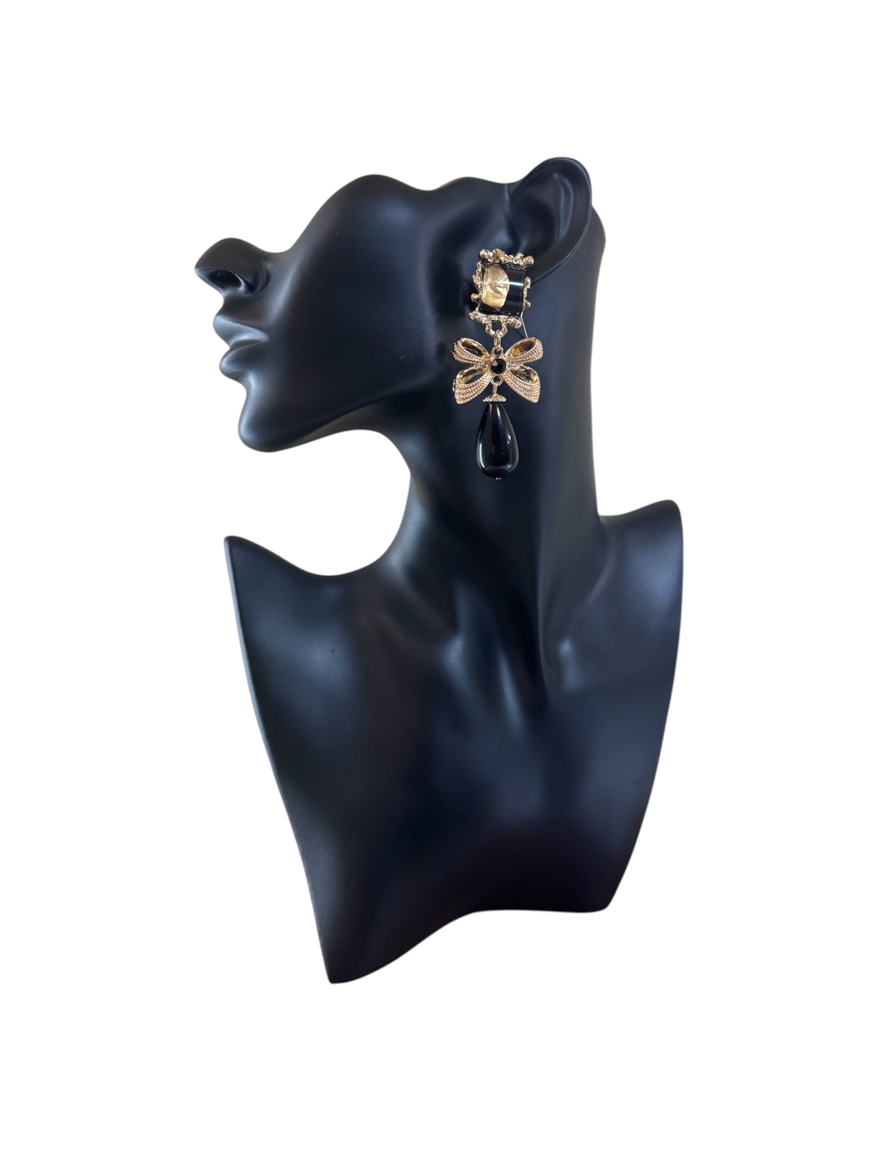 Pendientes dorados con lazo, lágrima negra colgante y cierre de clip.