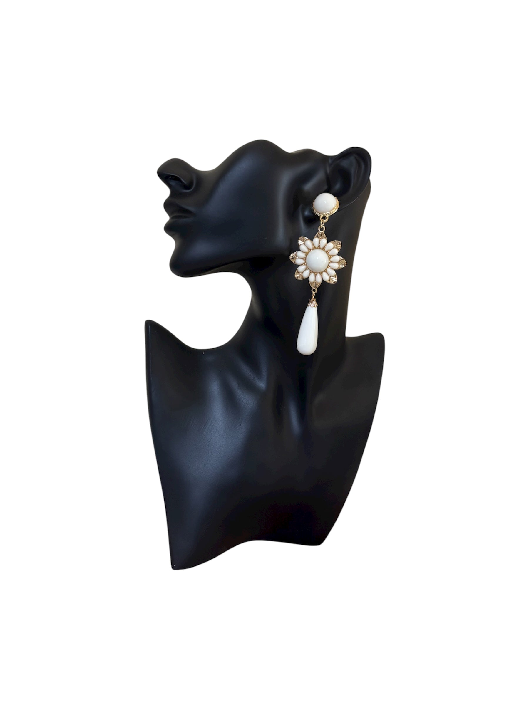 Pendientes blancos con diseño floral y colgante en lágrima.