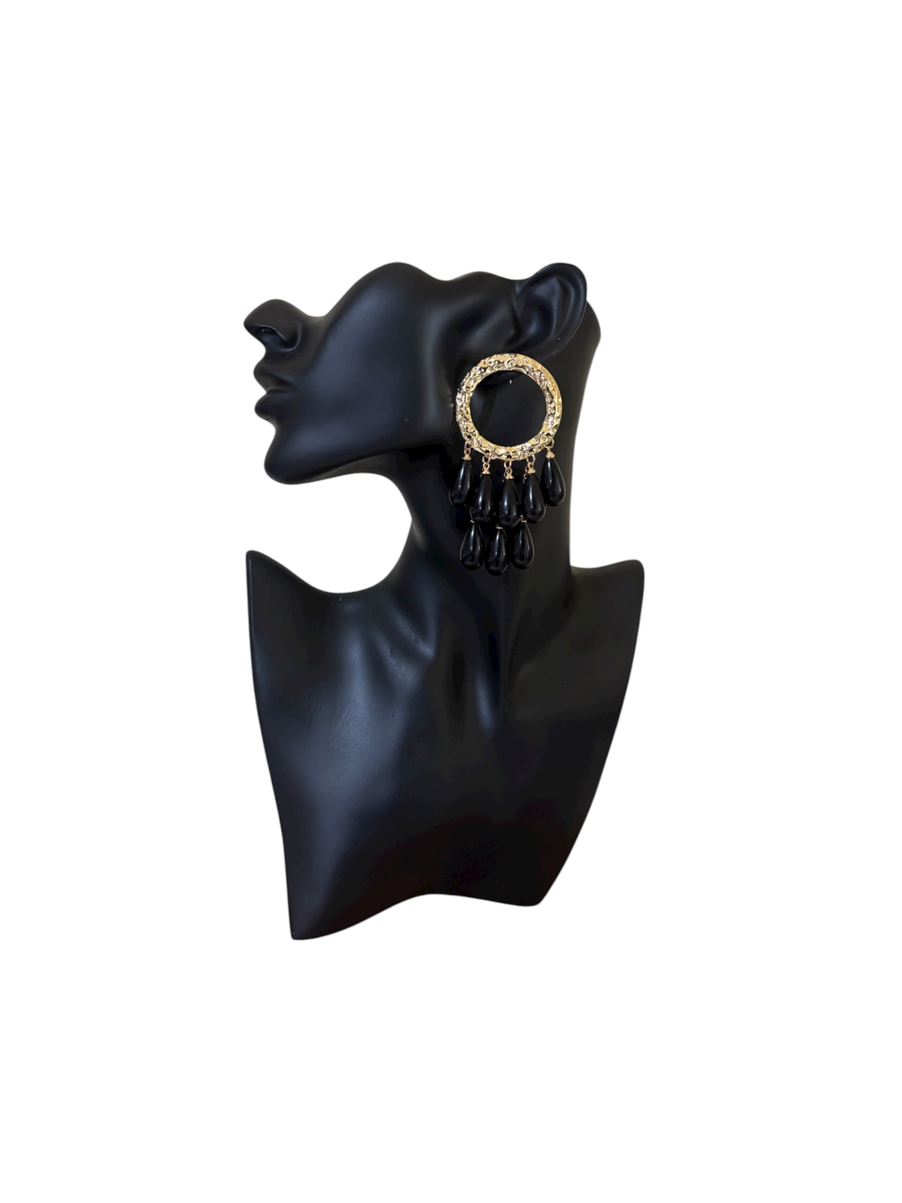 Pendientes grandes dorados en forma de aro con lágrimas negras colgantes.