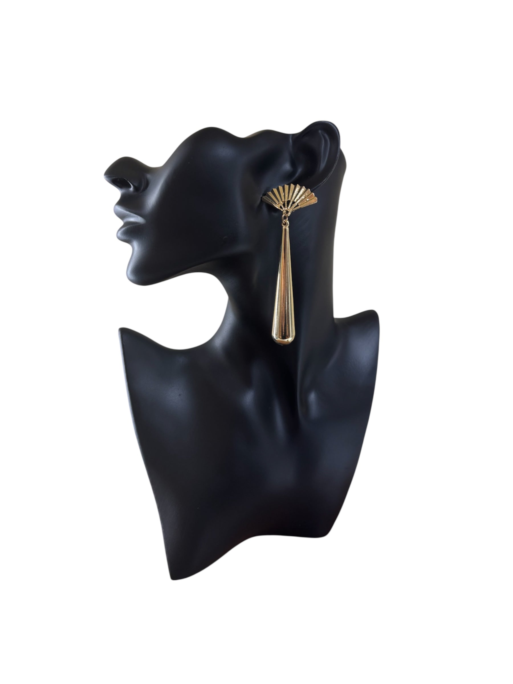 Pendientes largos dorados con diseño en forma de lágrima estilizada.
