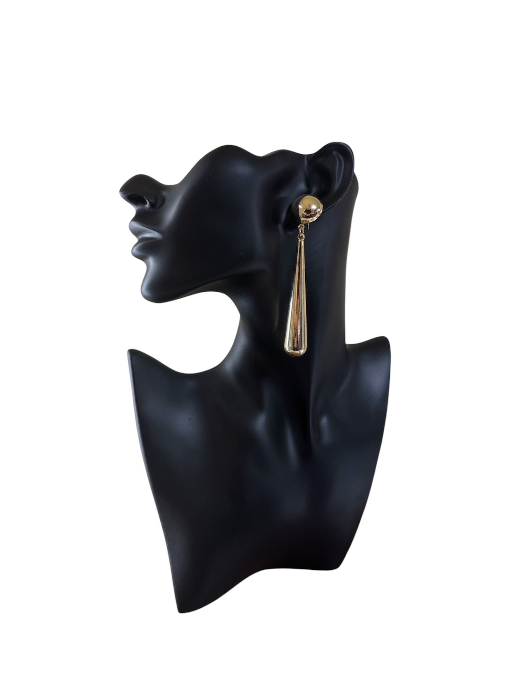 Pendientes largos dorados con diseño en forma de lágrima estilizada.